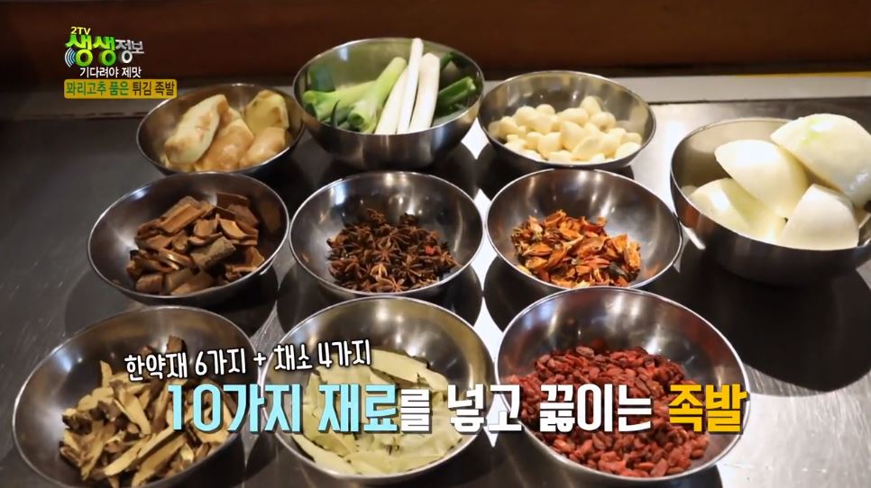 기존 족발에서 느낀 한 비계를 벗겨내야 튀겼을 때 느끼함이 없어진다고 해요. 살코기가 많은 뒷다리를 사용해요. 그리고 한약재 6가지와 채소 4가지 총 10가지 재료를 넣고 끓이는 족발.