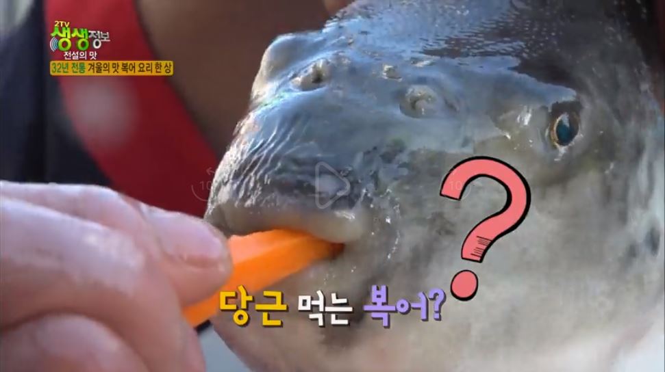 당근 먹는 복어를 보셨나요? 우걱우걱 씹어먹는 힘도 좋다고 합니다. 강원도에서 오는 자연산 복어로 겨울 11~12월에 많이 나오는 복어는 횟감은 3년 산, 불고기감은 1년 산을 쓴다고 하는데 미나리로 복어 숙성하면 부드러워진다고 합니다.
