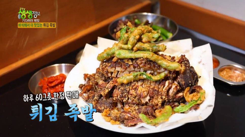 우리가 평소 먹던 족발에 밀가루, 튀김가루, 볶은 현미, 쌀가루를 묻혀서 다시 한번 튀겨낸 튀김 족발, 그리고 꽈리고추 튀김으로 느끼함까지 잡았다고 하는데 하루 60그릇 한정으로 판매한다고 합니다.