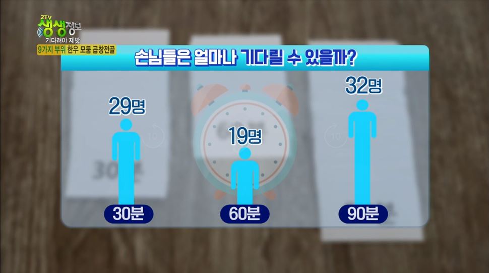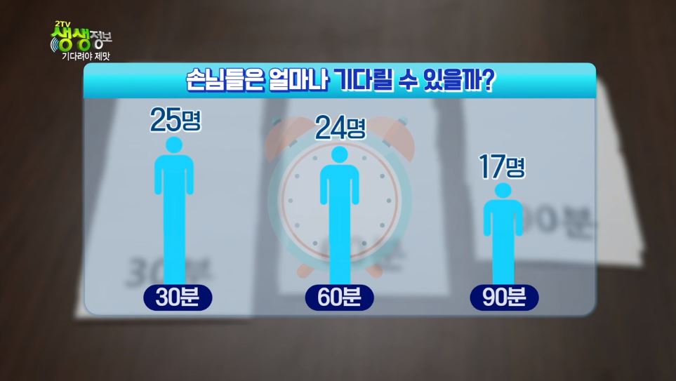 튀김 족발과의 짝꿍 토마토 비빔면인데 삼겹살에 비빔면 먹는 느낌이라고 하는데요, 손님들은 얼마나 기다릴 수 있다고 답변했는지 보실까요? 30분, 60분 비슷하게 기다릴 수 있다고 답변을 했네요.