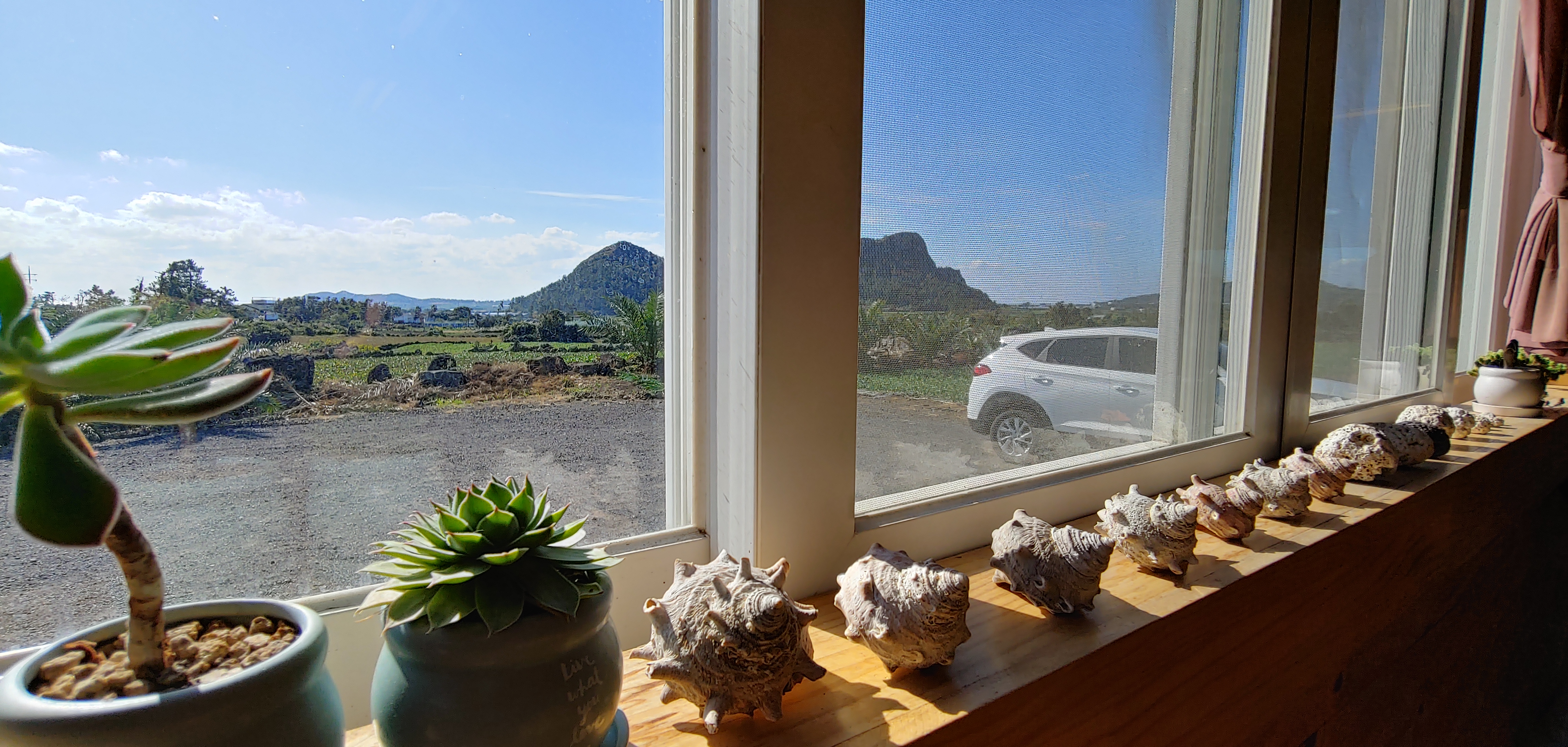 어떤가요? 소라들이 줄지어서 가지런히 놓여있고 창문 너머에는 드넓은 밭과 저 뒤로 보이는 곳이 산방산이라는 곳입니다. 밖에는 야자수 나무들과 귤나무들이 잔뜩 자리 잡고 있습니다.